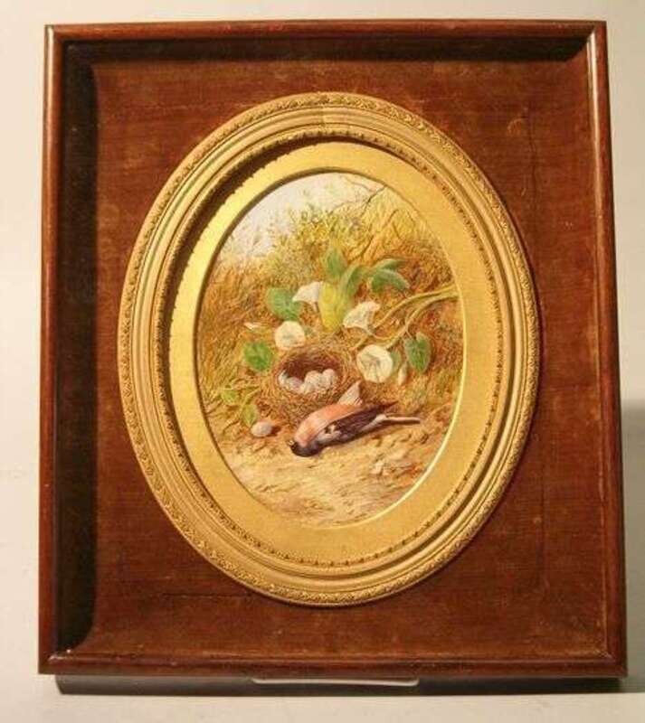 Oval watercolor on paper depicting a dead bird beside a nest with eggs. Watercolor, H: 7 3/4, W: 5 1/2 in., shadowbox H: 14 1/2, W: 12 1/2 in.