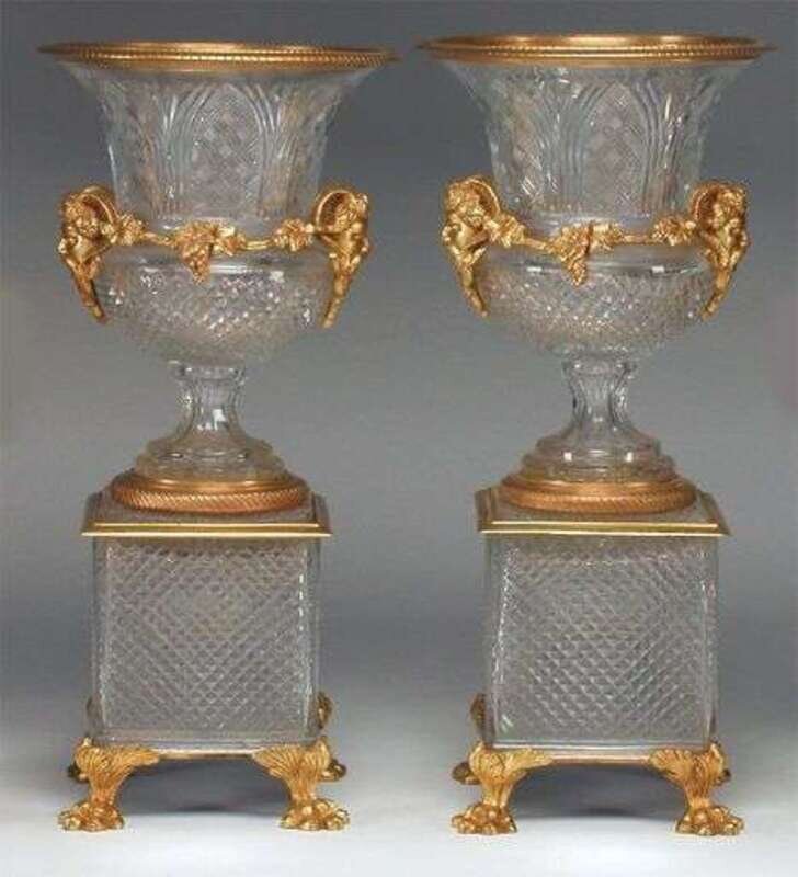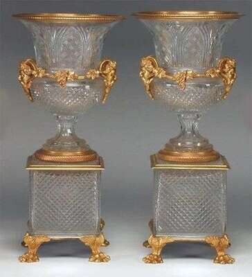 PAIR OF EMPIRE STYLE CUT GLASS & GILT METAL MOUNTED URNS