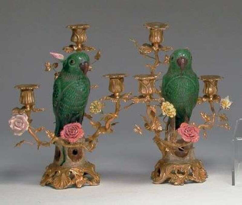 Each mounted with a parrot on ornate rococo scroll base from which issue three flower-encrusted candelabra. H: 13 in.