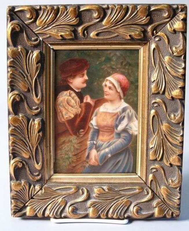 Signed indistinctly, painted with courting couple, inscribed verso, framed. H: 6, W: 4 in.