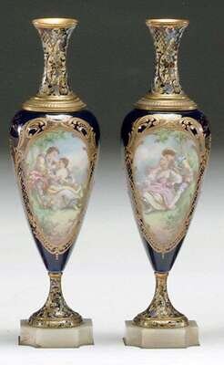 PAIR OF SEVRES-STYLE GILT-BRONZE & ENAMEL URNS