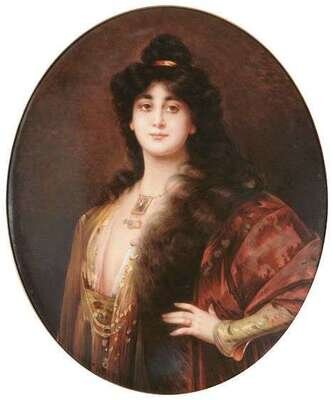 Finely painted, with a gypsy girl and wearing a rich red coat with a fur collar. Impressed KPM and scepter mark. H:13 1/2, W: 11 in.