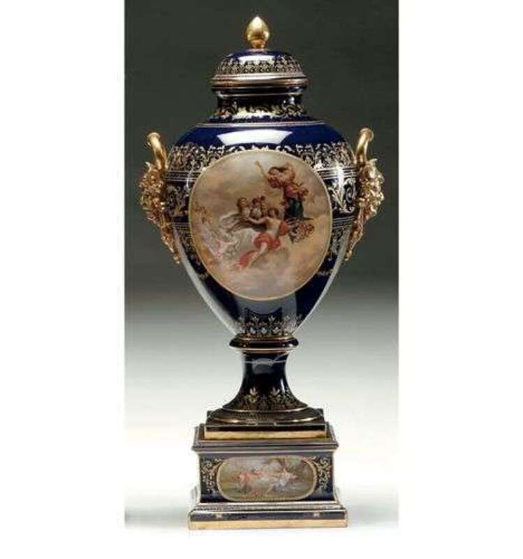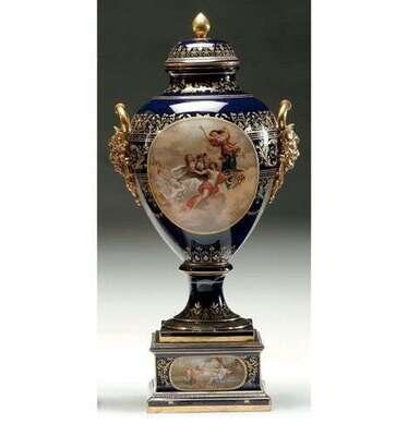 Bearing Vienna mark, centrally painted in colors with a classical scene in the manner of Angelica Kauffman against a cobalt ground, finely enameled with bands of foliate scrollwork and anthemion, with gilt satyr-head handles, together with a square base of conforming decoration. H: 30 in.