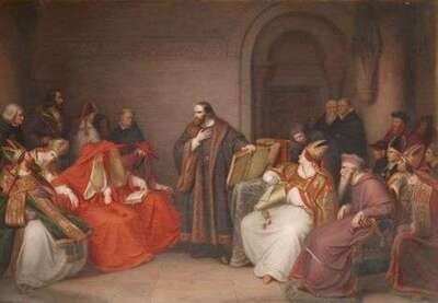 After Karl Friedrich Lessing, "Huss Before the Council of Constance Bach, Printed Whimer & Co., Gallery of Fine Arts, Munich," impressed KPM & scepter mark. H: 14 1/2, W: 20 1/2 in.