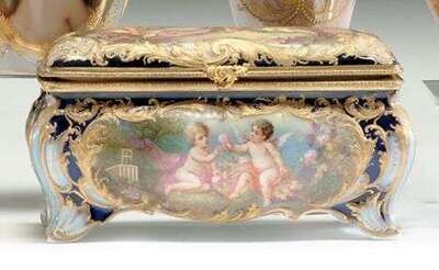 Bearing Samson mark, of casket form with bombé sides and domed cover, painted with putti and musical instruments in reserves against a cobalt ground enriched in gilding. H: 6, L: 10 1/2 in.