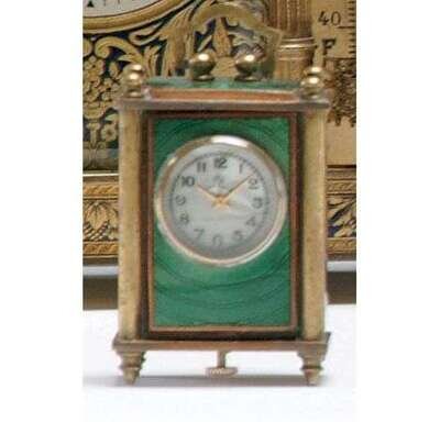 The round clock face signed, "PL" and set within a green guilloche enamel case with carrying handle. H: 2 in.