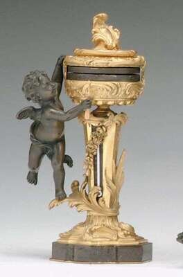 Stamped BOUDET, 43 Boulevard des capucines, Paris. The cylinder-form timepiece supported on a tapering pedestal, a putto holding an arrow to indicate the hour and supported on a shaped marble base. H: 10 1/2 in.