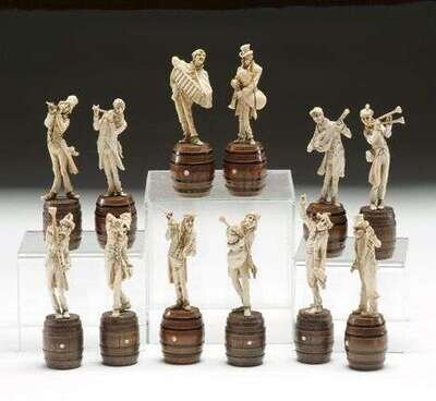 Probably Dieppe. Comprising eleven musicians and one conductor with baton, each standing atop a carved wood barrel. H: 6 1/4 in.