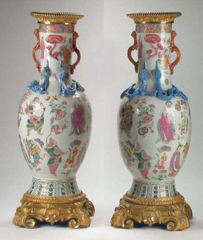 PAIR OF CHINESE FAMILLE ROSE & GILT-BRONZE MOUNTED VASES
