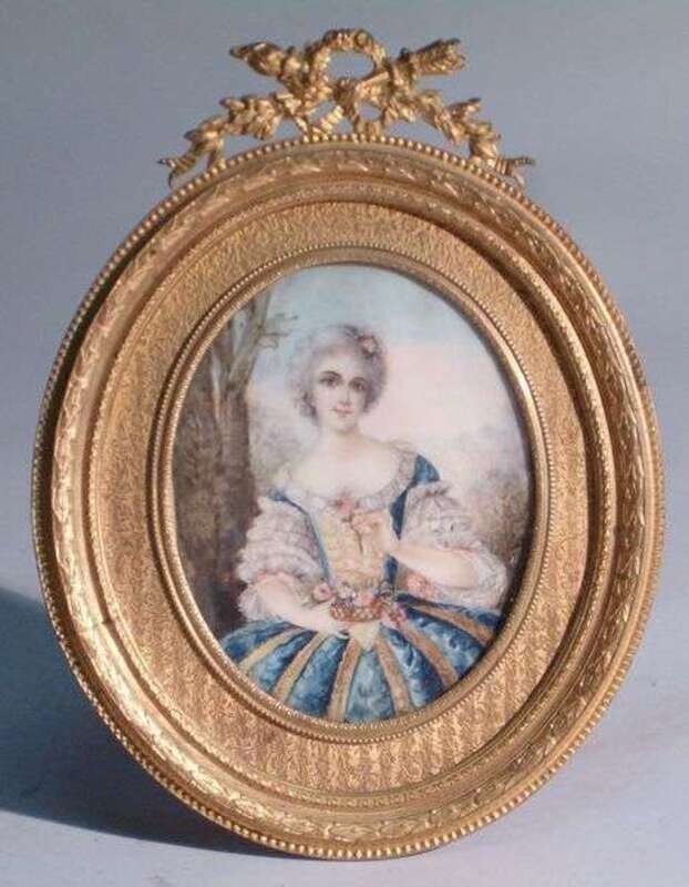 Signed, Cellu. Depicted in a landscape setting, wearing a blue 18th century-style court dress and holding a small basket of flowers. H: 3 3/4, W: 3 in.
