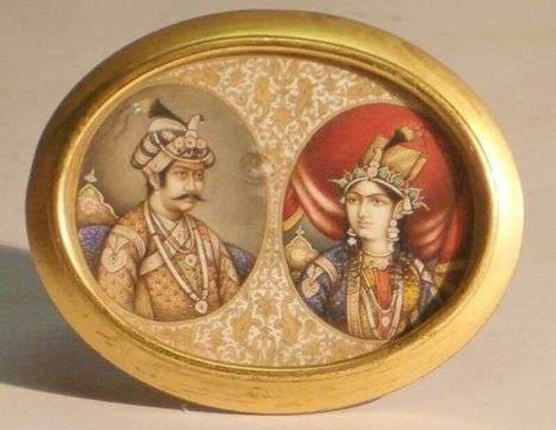 Finely painted in colors with a Mughal prince and consort, each in an oval reserve against a white and gold figured ground. H: 2 3/4, W: 3 1/4 in.
