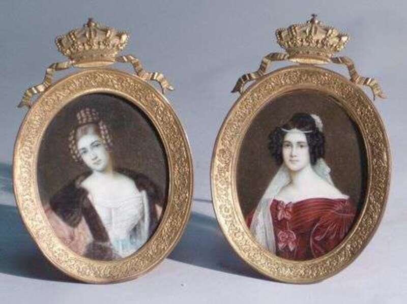 Signed Kraft, after the original in the Munich Residenz. Painted with a pearl ornament in her dark ringlets and wearing a white lace veil and a burgundy gown trimmed in lace and adorned with bows. H: 4 1/8, W: 3 1/8 in. Together with a portrait miniature of the Grafin Holstein, signed Kraft, wearing an elaborate braided coif, a white gown with blue belt and a fur-trimmed cloak. H: 4 1/8, W: 3 1/8 in. Both in elaborate gilt metal frames, surmounted by crowns.