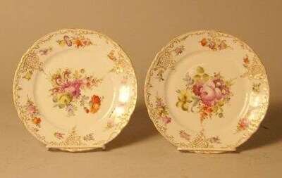 Bearing GS mark, probably Thuringian. Each centrally painted with flower sprays within a molded border similarly decorated with flowers and enriched in gilding. Dia: 7 3/4 in.