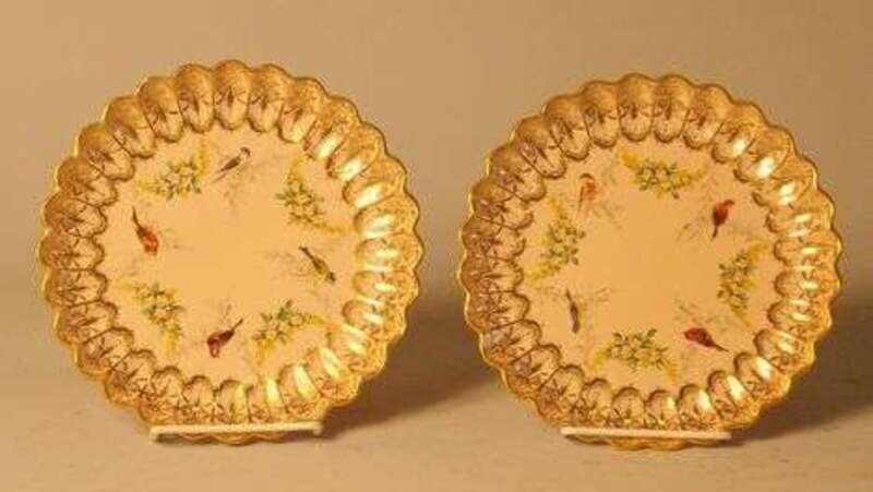 Impressed mark, each of lobed circular shape and finely painted with birds on flowering branches and enriched in gilding. Dia: 8 1/2 in.
