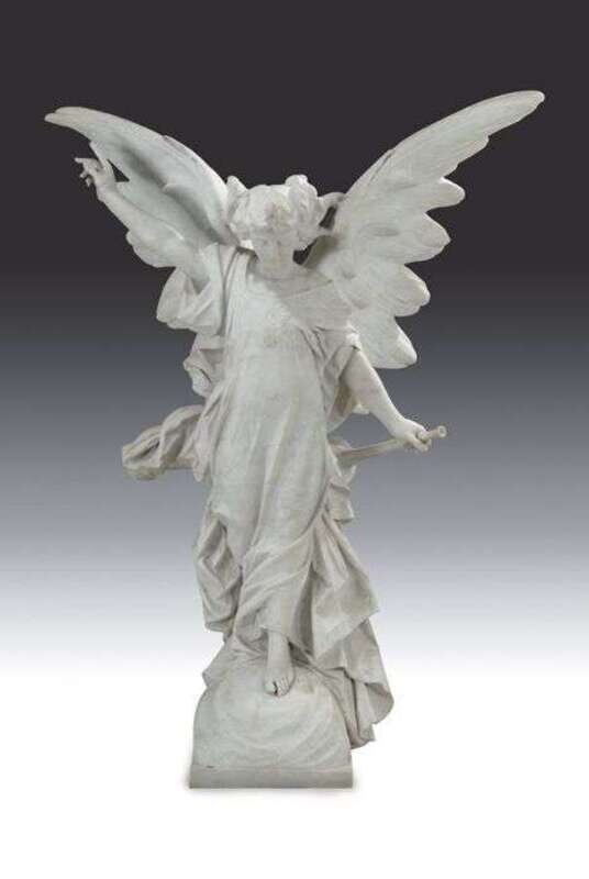 With outstretched wings, one hand pointing aloft, the other holding a trumpet, standing on a cloud and raised on a square base. H: 75, W: 53 1/2 in.