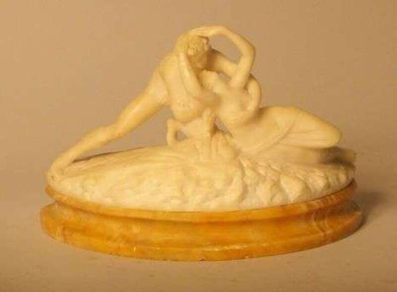 Depicted embracing on a naturalistic landscape base. L: 11 1/4 in.