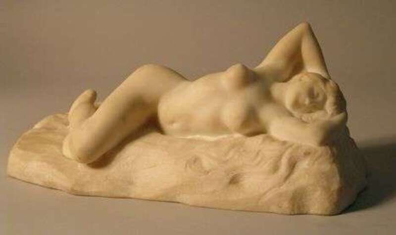 Reclining on a rocky landscape, hands behind her head with flowing hair. H: 7 1/2 in., L: 18 in.