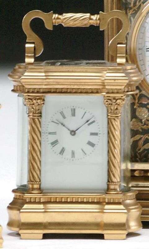 The enamel clockface set within a beveled glass and gilt bronze case with Solomonic column mounts H: 3 1/2 in.