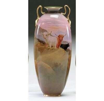 Printed mark, signed Kelsall. Of ovi-form shape, with an everted lip, with curving gilt handles, and finely painted with Highland cattle set against an extensive landscape scene. H: 14 1/4 in.