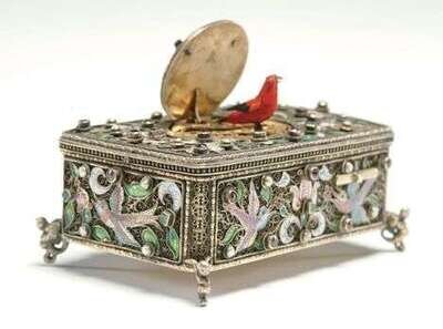 FINE SWISS FILIGREE, ENAMEL & GEM-SET AUTOMATON SINGING BIRD BOX