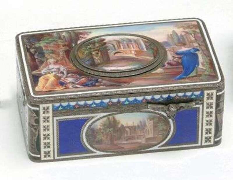 The bird with red/black plumage, moving beak, wings and perch, beneath an oval lid and top enameled with two ladies and gentleman in 18th century costume within a walled garden, the sides with two further enameled panels depicting architectural landscapes. H: 1 1/4 in., W: 4 in.