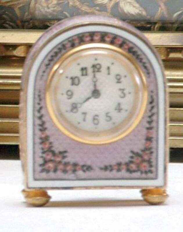 The rounded enameled clockface set within an enameled case decorated with roses against a mauve ground, the whole supported on toupie feet. H: 1 3/4 in.