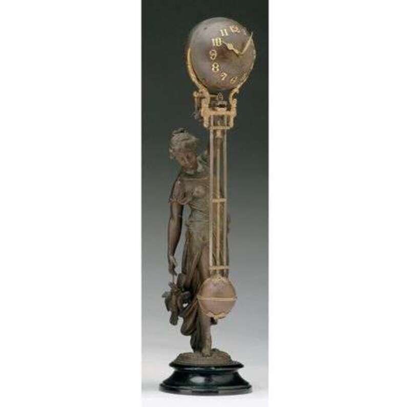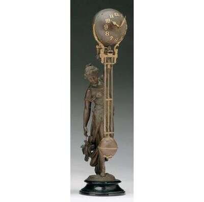 Formed as a classical maiden suspending a globe form clock. H: 19 in.