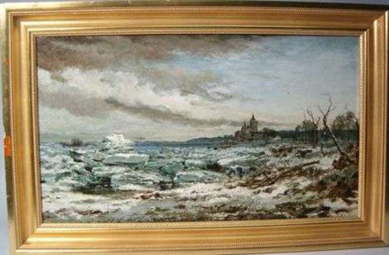 Depicting a stormy coastal landscape with castle in background. H: 18 1/2, W: 31 1/2 in.