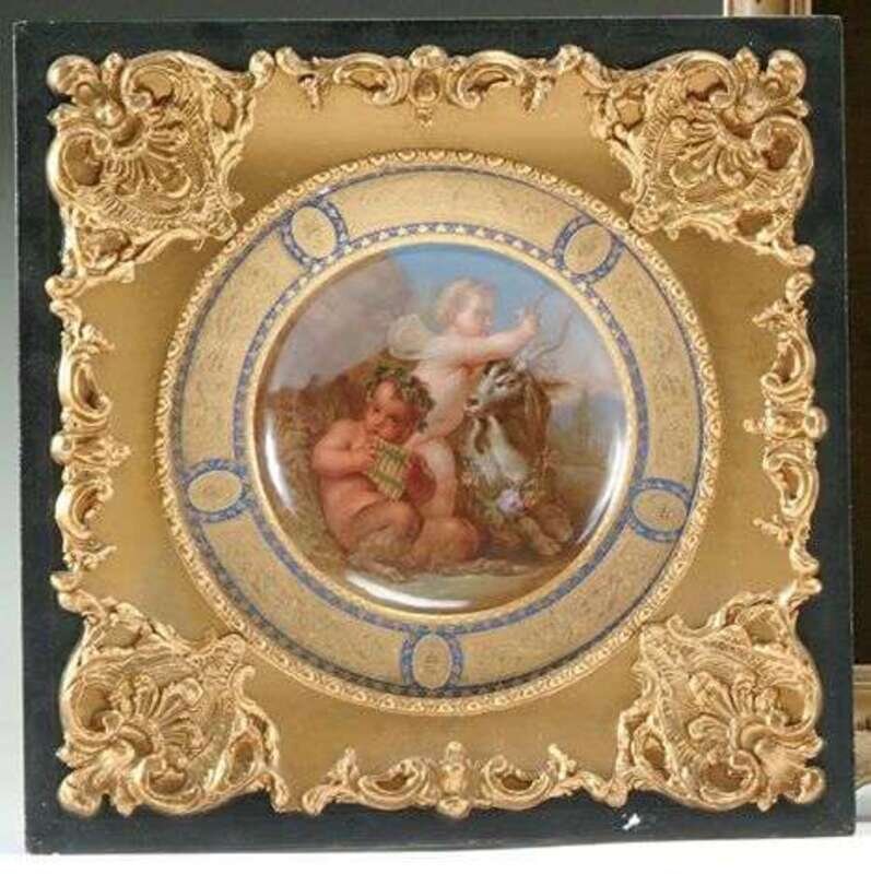 Bearing Vienna mark, signed "J.W.," finely painted in colors with Eros and a child satyr and a goat, within an elaborate gilt and blue border. Dia: 9 1/4 in. (mounted in a shadowbox frame).