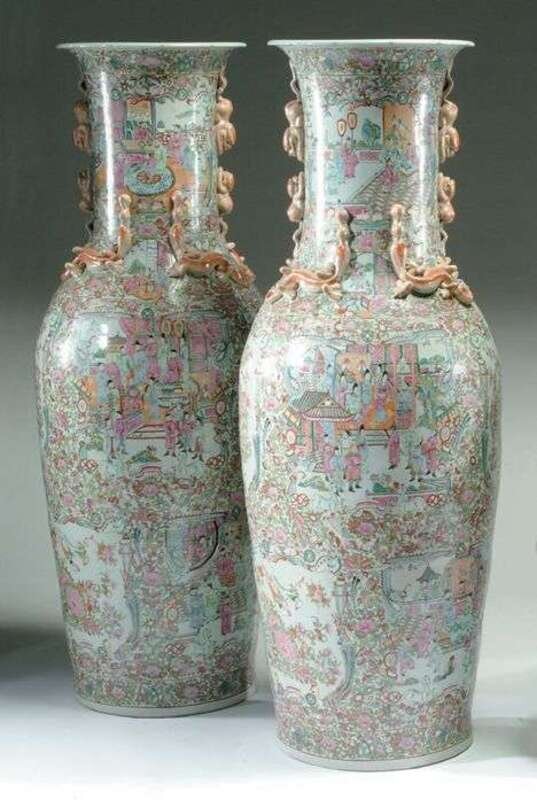 The flared necks applied with dragons or sea serpents, the sides with typical allover floral and figural decoration. H: 56 1/2 in.