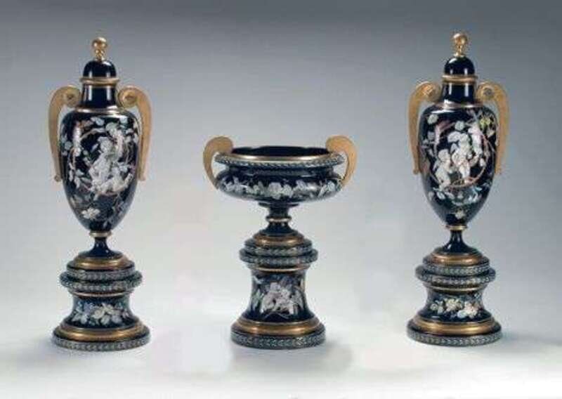 FINE ENGLISH ENAMELED GLASS & PARCEL-GILT GARNITURE