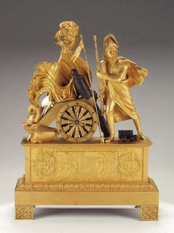 The paneled frieze decorated in relief with figure and laurel wreaths surmounted by a figure of a French soldier standing beside a cannon and flag raised on anthemion cast ogee molded rectangular base and conforming bracket feet. H: 27, W: 19, Dia: 6 1/2 in.