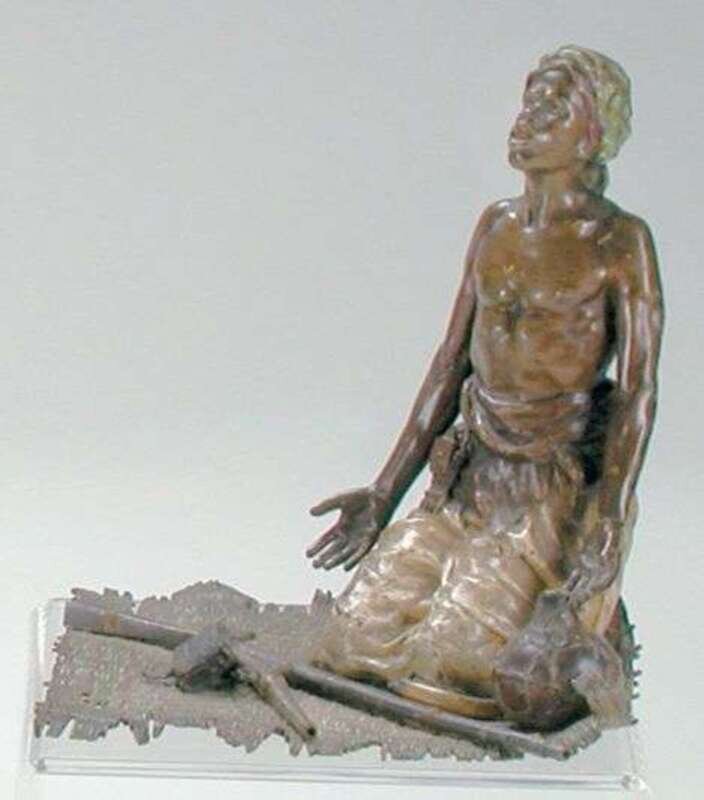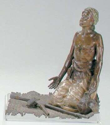 Modeled as an Arab kneeling on a rattan mat with weapons and powder horns laid out before him. H: 8 in.