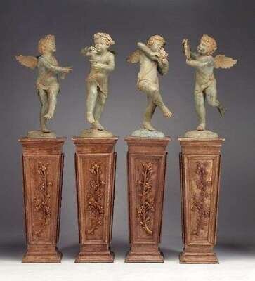 Each cherub playing a musical instrument raised on associated carved wood pedestals. Figures H: 32 in. approx., pedestal H: 39 in.