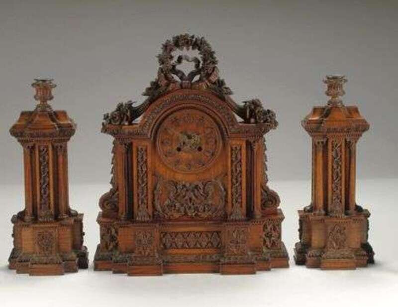 AUSTRIAN CARVED WALNUT CLOCK GARNITURE