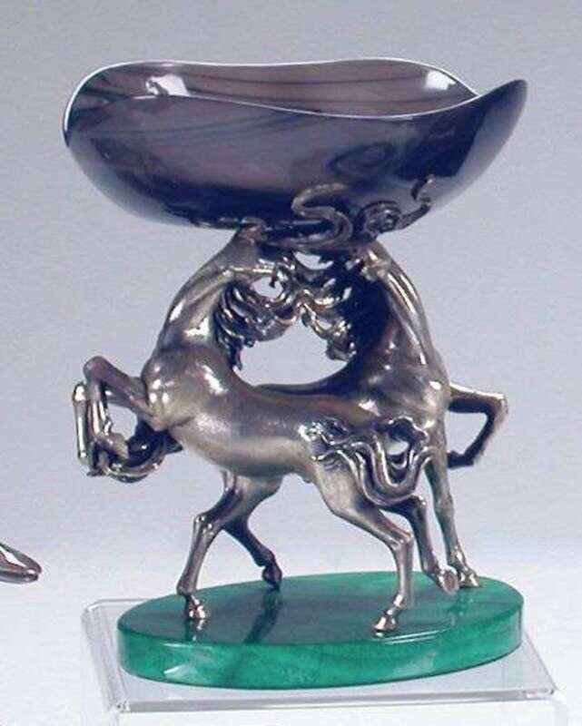 The agate bowl, supported by two stallions, raised on an oval base.