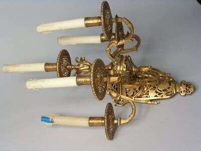 With pierced scroll back plates from which emanate five candelabra arms. H: 17 1/2 in.