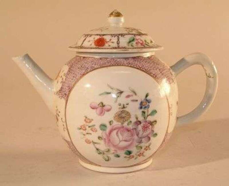 Finely enameled with flowers in reserve against a puce scale ground. H: 6 in.; together with a famille rose teapot. H: 6 1/2 in..