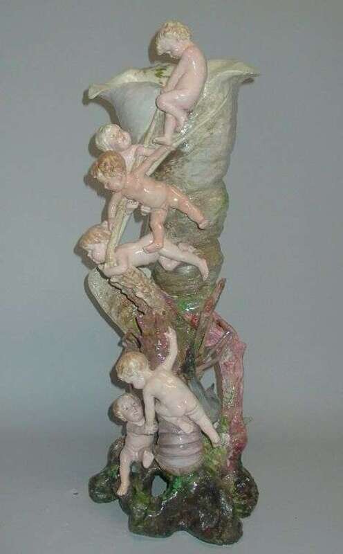 Possibly French, bearing monogram. Formed as a figural group of water babies fighting with a lobster within an elaborate group of shells and rockwork.