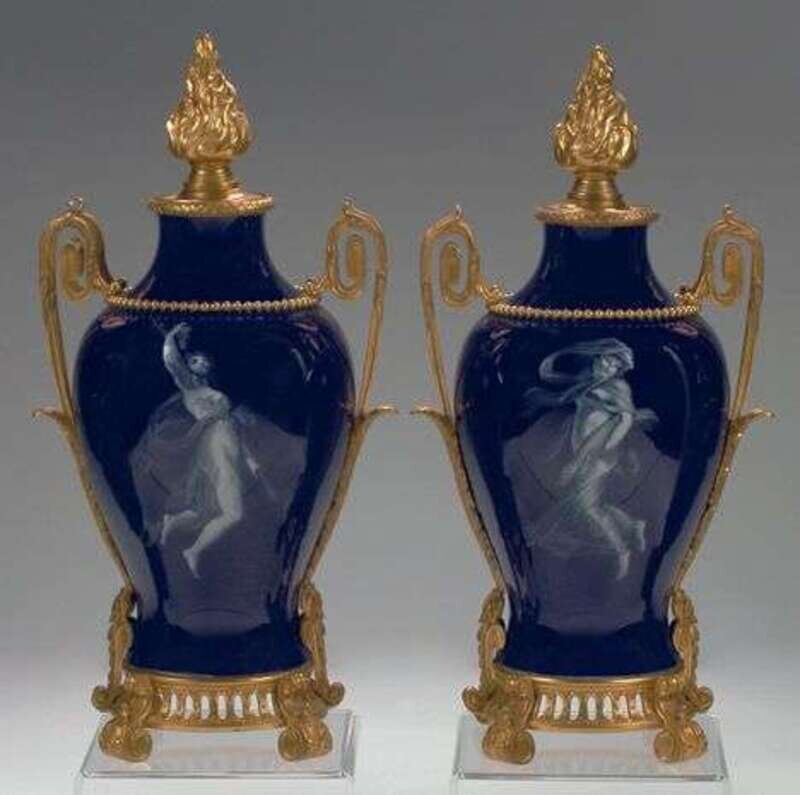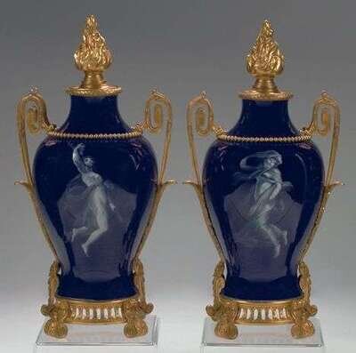 PAIR OF SEVRES-STYLE PATE SUR PATE & GILT BRONZE VASES