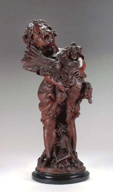 Signed indistinctly, depicting a young child holding a cockerel. H: 35 in.