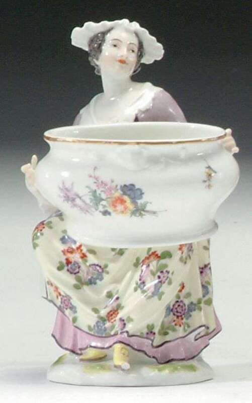 Formed as a woman holding a large flower-painted jardiniere and seated on a rock work base, wearing a white cap, purple dress and flowered apron. H: 7 3/8 in.