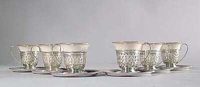 Comprising six cups with pierced holders and scrolling handles and six saucers, with original silk-fitted presentation box. D: 3 3/4 in.