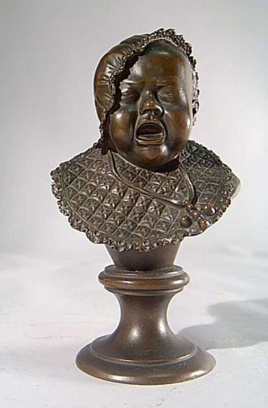 Realistically cast wearing a bib and cap, with a pacifier hanging around its neck, on a socle base. H: 6 1/2 in.