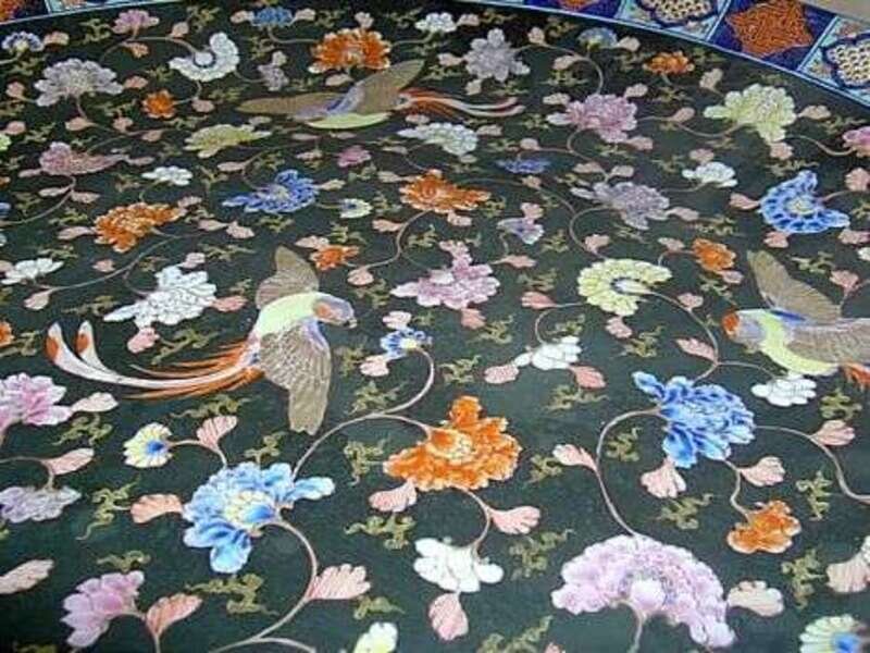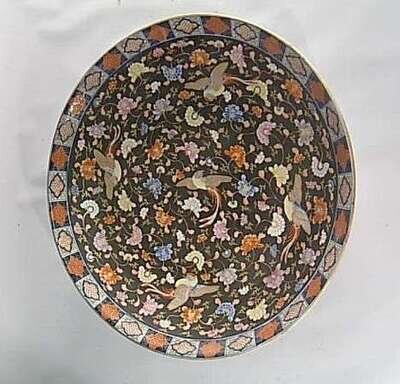 Enameled in colors with birds and flowering vines against a black ground, within a border of alternating panels of brocade and diaperwork. D: 20 3/4 in.