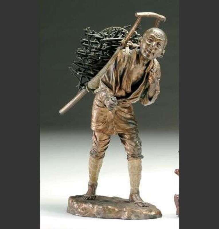 JAPANESE BRONZE FIGURE OF A WOOD CARRIER