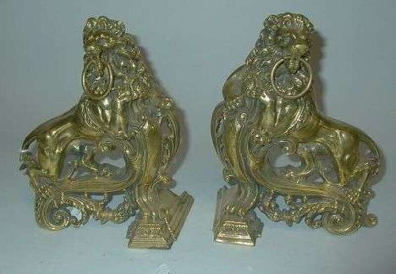 Each molded as a lion with flowing manes and raised on rococo scroll bases. H: 9 1/2 in.
