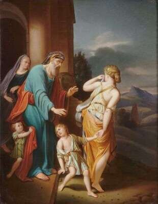 Impressed mark, after the oil painting by Adriaen Van der Werff. Finely painted in colors with the Biblical scene, mounted in a giltwood frame. H: 10 7/8. w: 8 1/2 in.