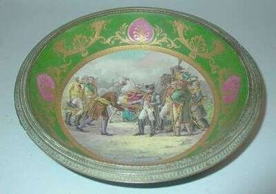 Signed Guitton, finely painted in colors with a scene of Napoleon accepting the keys to a city, within a border of gilt anthemion against a green background. D: 14 in.