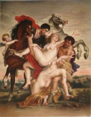 Impressed mark, after Peter Paul Rubens. Finely painted in colors with Castor and Pollux abducting the Sabine women H: 11 5/8, W: 9 in.